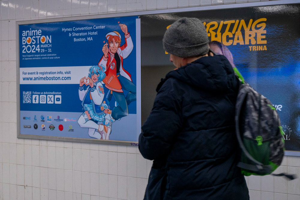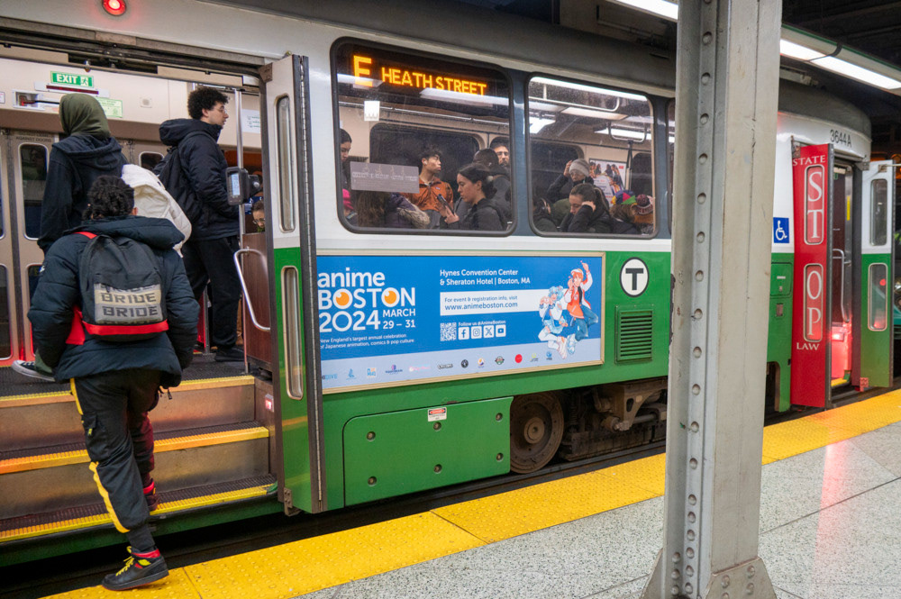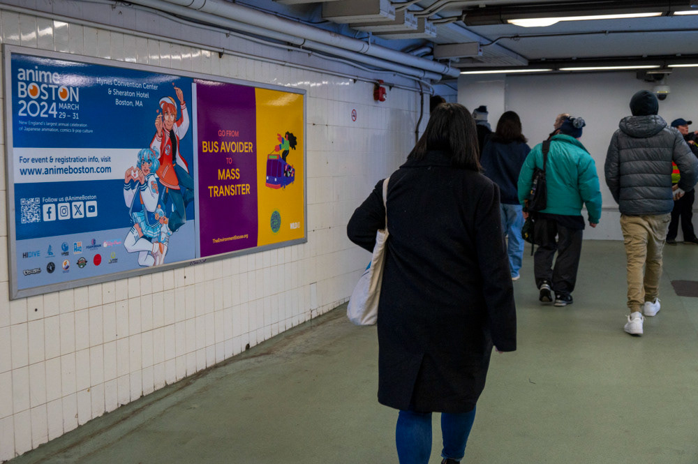 Anime Boston is the Northeast's biggest annual Japanese pop-culture convention. In 2024, it topped admission records with 40,000 attendees. As a graphic designer in the PR and Publications Department, I advertised the convention across Boston's Massachusetts Bay Transportation Authority trolley exteriors and subway interiors.