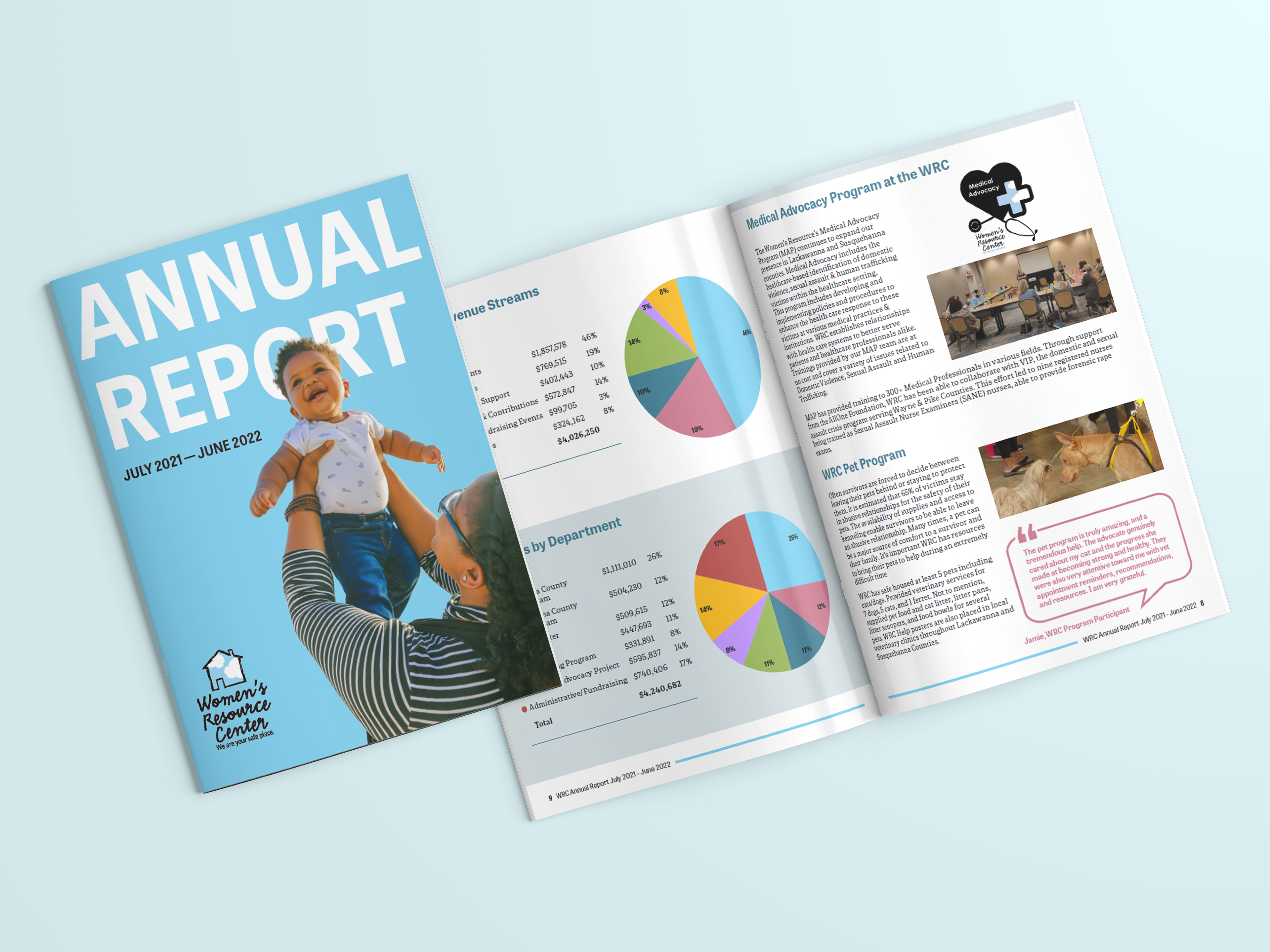 I lead the Women's Resource Center 14-page annual report design from concept, copy, and design—to pre-flighting and coordinating the final print project with the printers.